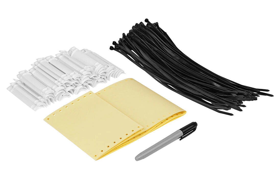 Поставляется наборами, состоящими из 50 пластмассовых бирок с проушинами, 50 самоламинирующихся маркеров для надписей, 100 пластмассовых стяжек длинной 250 мм и маркер-ручки перманентной для нанесения надписей.
